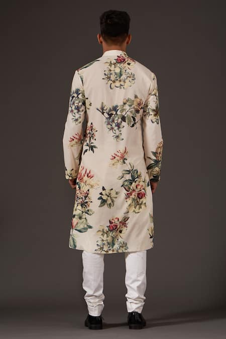 Ivory kurta with floral printed motifs, mandarin collar & front buttons. Paired with churidar.