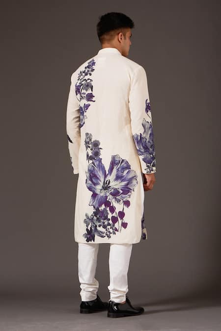 Ivory kurta with floral printed motifs, mandarin collar & front buttons. Paired with churidar.