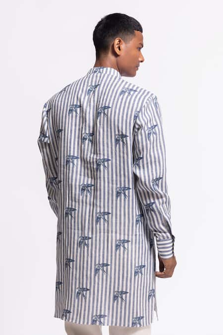 Ivory and blue striped kurta made from linen fabric featuring palm tree motifs
