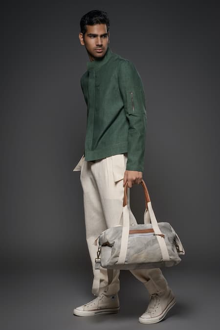 Green linen jacket featuring a high neck and full sleeves with zip detailing on the sleeves