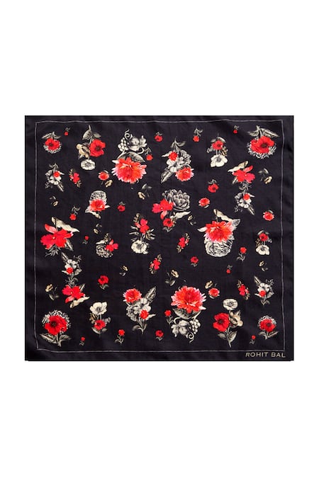 Black satin pocket square with floral printed motifs. Comes with floral printed tie.