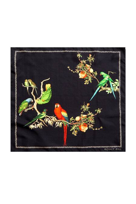 Black satin pocket square with bird printed motifs. Comes with bird printed tie.