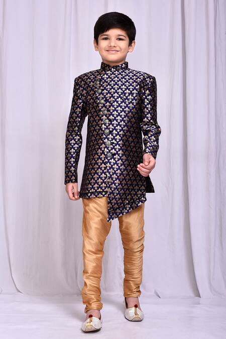 Navy blue asymmetric sherwani featuring a jacquard base and statement buttons