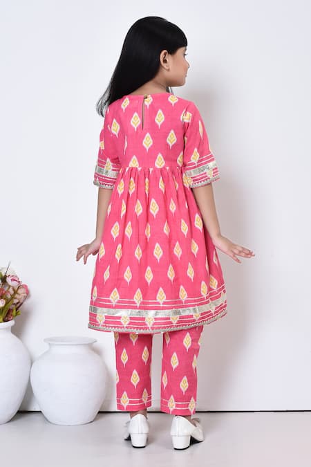Buy_Petite Pomme_Pink Cotton Gota Patti, Ikat Bloom Motif Print Aliya Cut Kurta With Pant _Online_at_Aza_Fashions