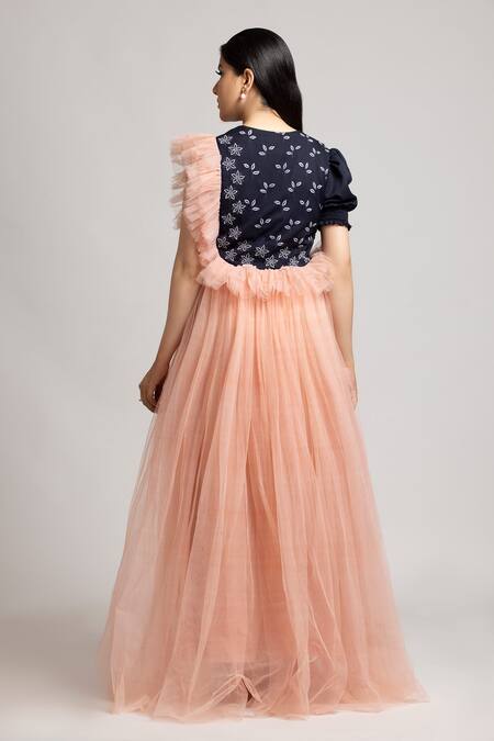 Peach frill gown with navy blue panel on the yoke and floral embroidery.