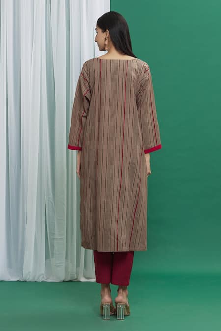 Brown cotton kurta featuring a stripe print and front button placket. Paired with a matching pant and a maroon dupatta with tassel borders.
