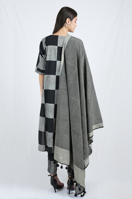Black and white kurta featuring box hand block print and round neckline. Paired with border printed pant and coordinating dupatta.
