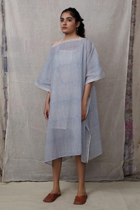 Multi Color Cotton Stripe Asymmetric Kaftan With Stole