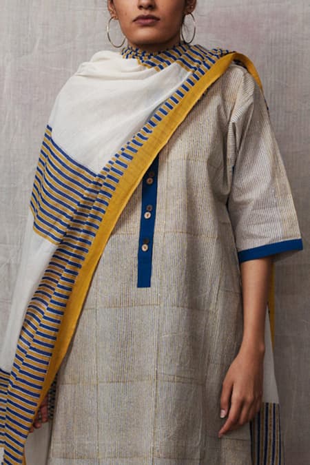 Blue, yellow kurta with stripe, geometric print all over. Paired with palazzo & dupatta.