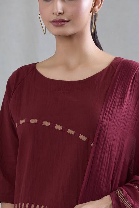 Maroon kurta featuring a round neckline, half sleeves, and geometric striped hand block print. Paired with matching pant and dupatta.