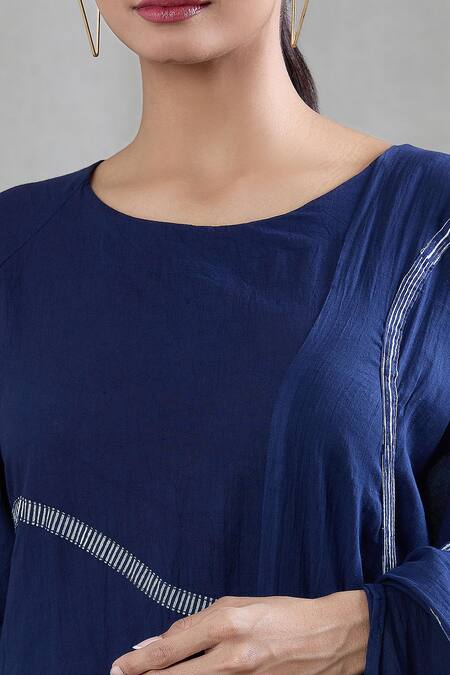 Blue Cotton Embroidery Round Neck Striped Print Kurta Set