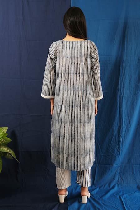 Blue and white striped kurta featuring a round neckline and long sleeves. Paired with matching pants and a striped dupatta.