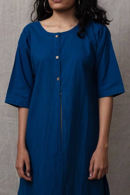 Blue Cotton Plain Round Neck Kurta And Flared Pant Set