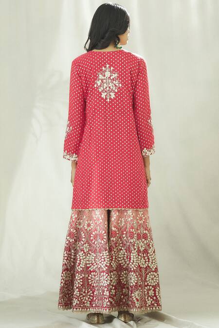 Red kurta with all over woven motifs and placement floral work. Comes with matching sharara and dupatta.
