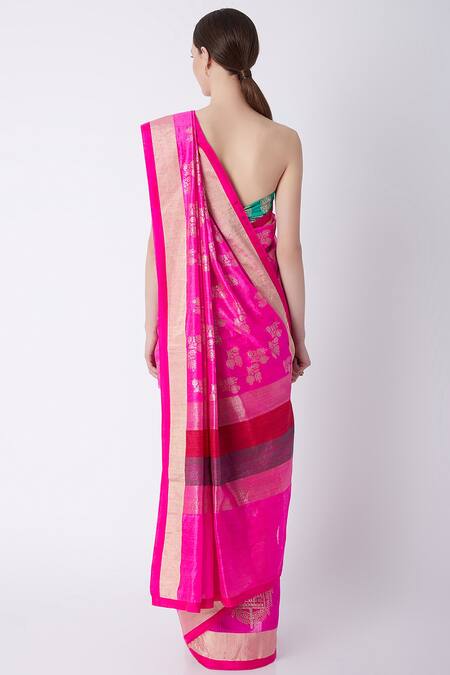 Pink banarasi saree with foil print all over. Comes with unstitched blouse fabric.