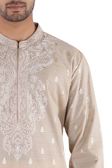 Beige banarasi kurta embroidered. Paired with off white churidar.