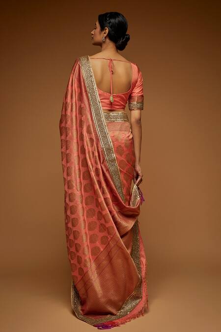 Orange Banarasi saree featuring mandala motifs with zardozi embroidered borders. Paired with a half sleeve padded blouse with back tie-up detail.