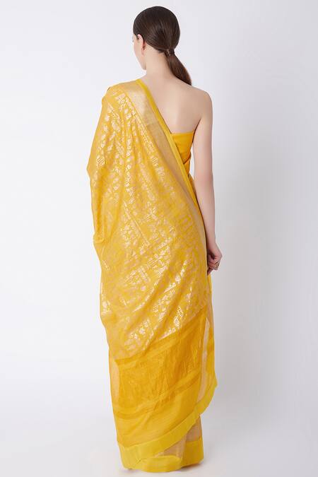 Yellow banarasi saree with foil print all over. Comes with unstitched blouse fabric.