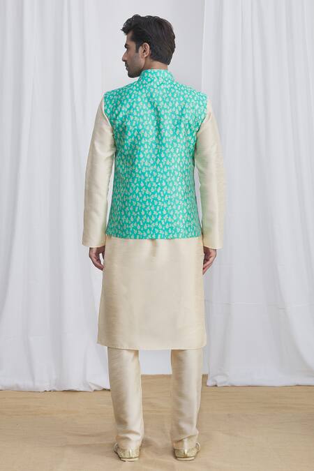 Teal green Nehru jacket with leaf motifs & embellished buttons. Paired with beige kurta & churidar.