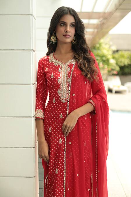 Red bandhani kurta featuring leaf neckline with cutdana and pearl embroidery. Paired with a matching pant and dupatta.