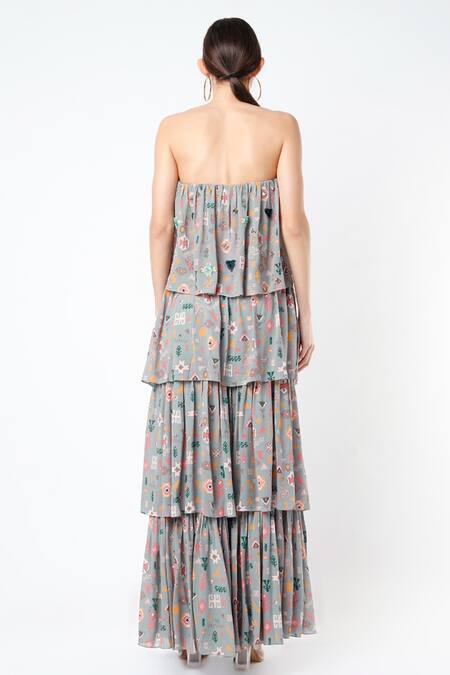 Grey georgette off shoulder top with bandhani kilim prints & embroidered highlights. Comes with grey bandhani kilim georgette printed deriya pants.