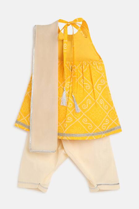 Yellow kurta featuring a halter neck design with bandhani prints and a back tie-up. Paired with a beige elasticated salwar and a viscose chiffon dupatta.