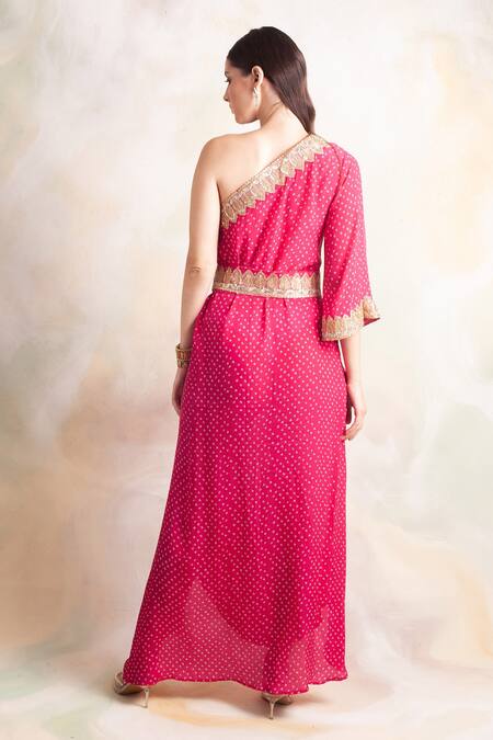 Pink Crepe Bandhani One Shoulder Dress