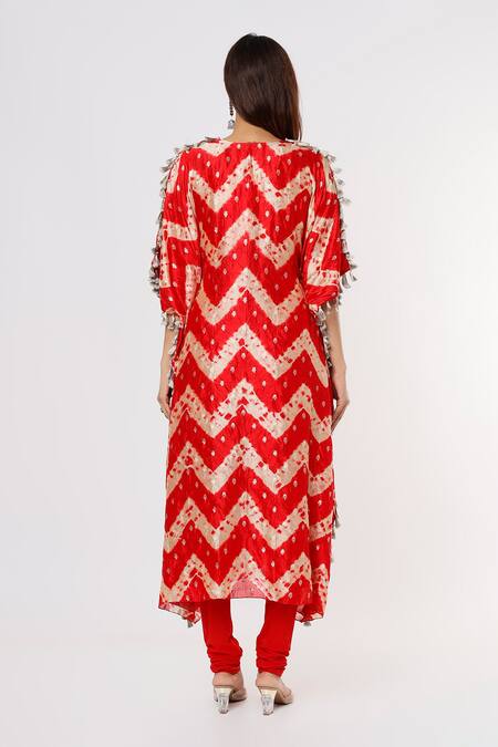 Red kurta featuring leheriya bandhani pattern with mirror embroidery on the yoke. Paired with a churidar, it has a notched neckline and three-quarter sleeves.