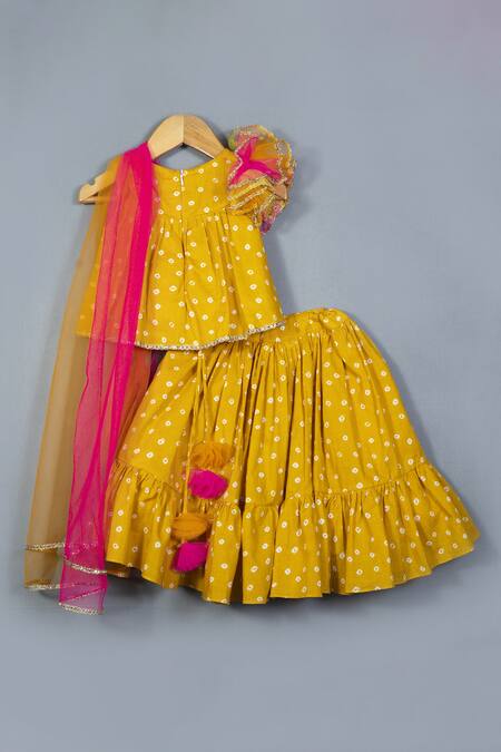 Yellow cotton bandhani flared lehenga featuring tassel detailing. Paired with a ruffle embellished top and dupatta.