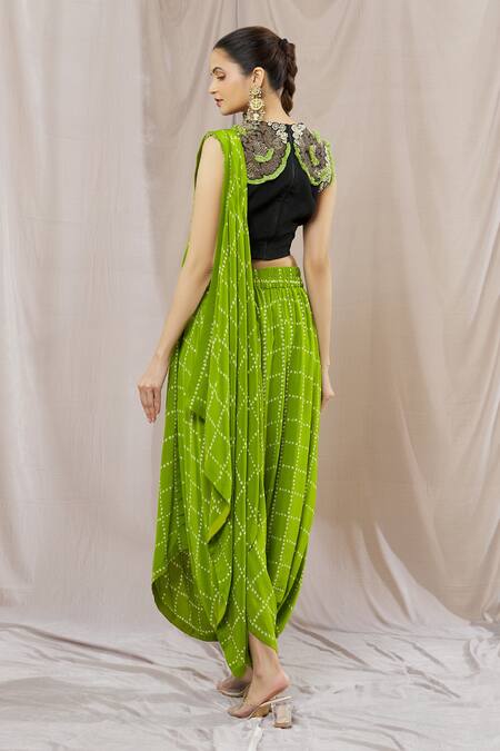 Green Crepe Sequins, Zari, Beads Round Bandhani Print Dhoti Saree With Blouse