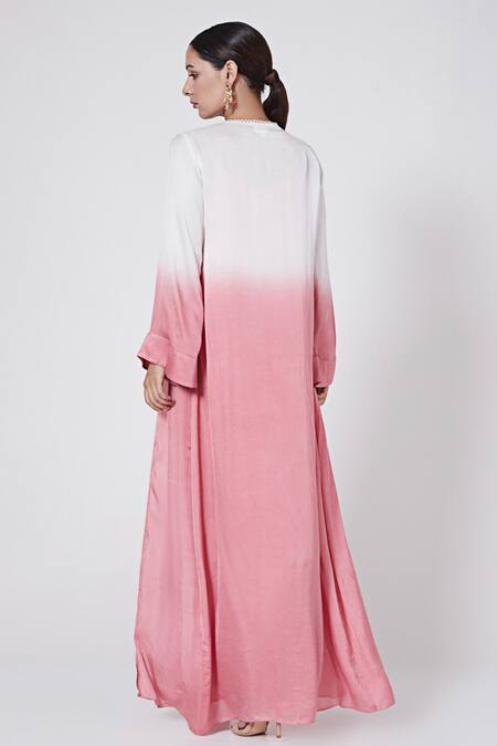 Blush pink modal blend draped dress featuring a cowl neck and bandhani print. Paired with an ombre jacket that has lace work at the borders.