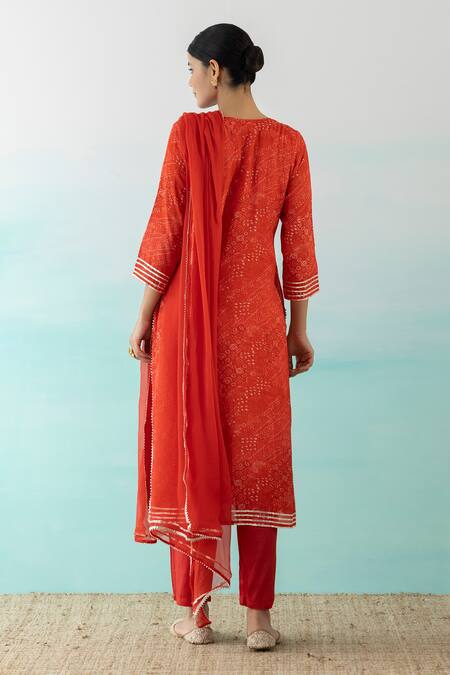 Red kurta with bandhani print, embroidered bodice & front tassel tie-up. Paired with pant & dupatta.