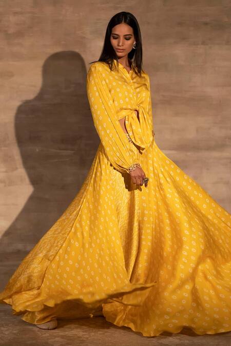 Yellow lehenga with bandhani motif prints & mirror embellished waistband. Paired with printed tie-up shirt.