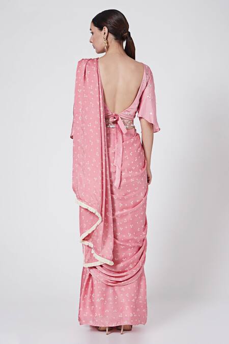 Blush pink pre-stitched saree featuring bandhani print, fringe detailing & zardosi embroidery. Accompanied by a hand embroidered stitched blouse and an embroidered belt.