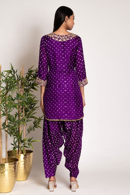 Purple Silk Gota Patti V-neck Bandhani Kurta With Patiala