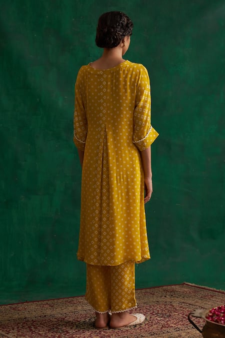 Lime green crepe kimono style shirt kurta with all-over bandhej prints. Comes with printed pant.