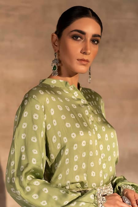 Buy_Basanti - Kapde Aur Koffee_Green Viscose Satin Bandhani And Mirror Band Shirt & Lehenga Set_at_Aza_Fashions