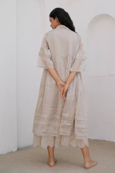 Beige gathered jacket featuring a lapel collar, three-quarter sleeves, and a front tie-up. Paired with a floral woven pattern dress showcasing a scalloped cut work hem and attached lining.