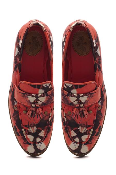 Multi color handcrafted leather loafers featuring an embellished trim with handmade tassels