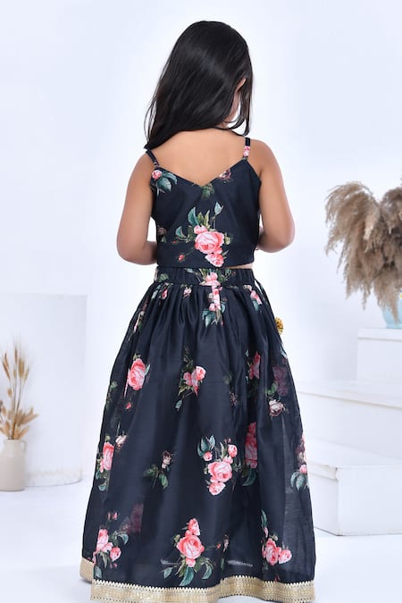 Buy_Bannhi By Priyanka Rathore_Black Organza, Chanderi Gota Patti Bloom Print Lehenga Set _Online_at_Aza_Fashions
