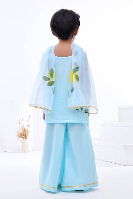 Sky blue straight kurta featuring gota embellishment and a scoop neckline. Paired with a sharara and a blossom hand painted dupatta.