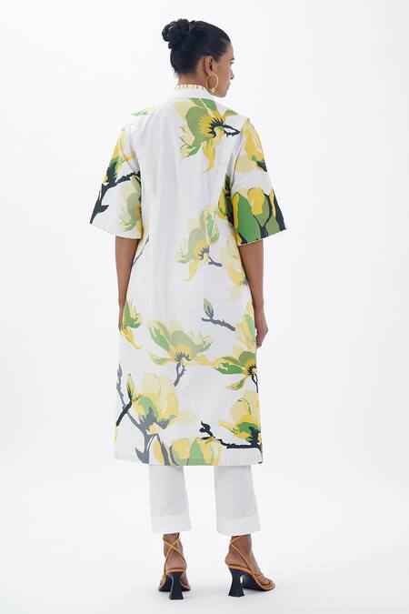 Ivory Poplin V-neck Basant Long Printed Tunic And Trouser Set