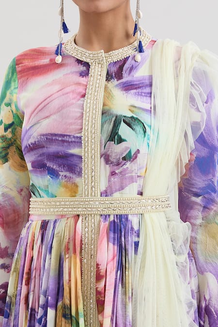 Multi colored padded Anarkali featuring abstract floral prints with sequins, cutdana, and moti work on the placket and collar. Comes with a coordinating embroidered belt and a frill hem sheer dupatta.