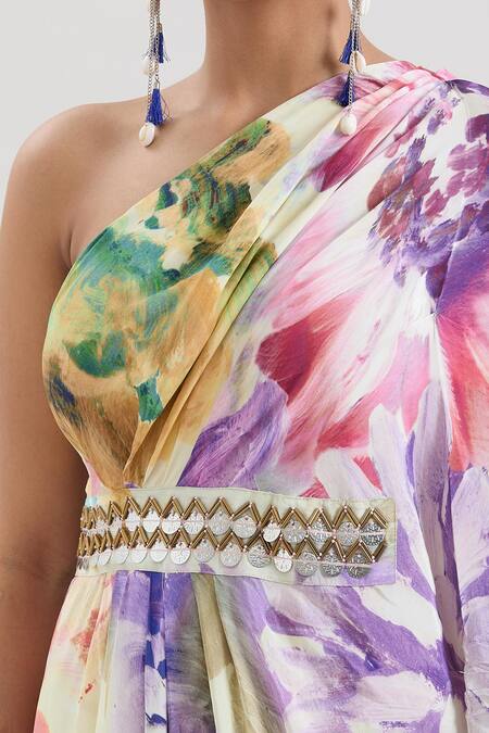 Multi colored one shoulder padded kaftan featuring abstract floral prints with pipe and coin embroidery
