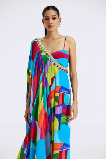 Multi Color Crepe Beads Asymmetric Abstract Pattern Dress
