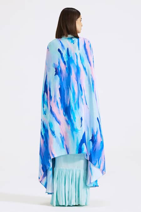 Blue Crepe Sequins, Cut Work, Ruffles Abstract Stripe Print Cape Skirt Set