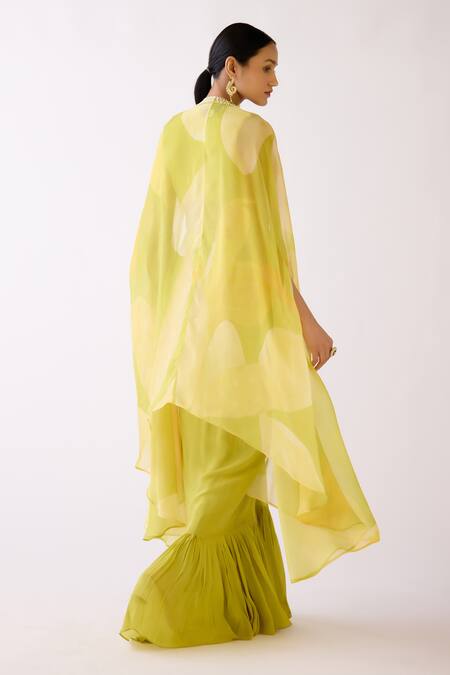 Yellow cape featuring beads embroidered border, paired with a padded blouse adorned with beads, cutdana, and sequin embroidery in an abstract pattern. The set includes a draped skirt with frill detailing on the hem.