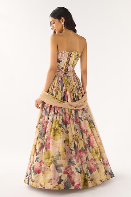 Beige organza lehenga set featuring a corset blouse with sequins and coin embroidery. Accompanied by a matching dupatta.