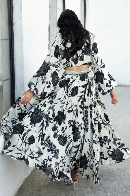 Ivory and black batwing sleeve top featuring a boat neckline and tie-up detail. Paired with a matching skirt adorned with embroidered waistband and all-over floral motifs.