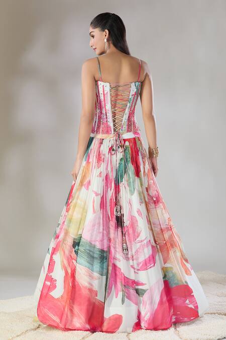 Multi Color Georgette Mirrors, Sequins, Botanical Print Pleated Lehenga Set